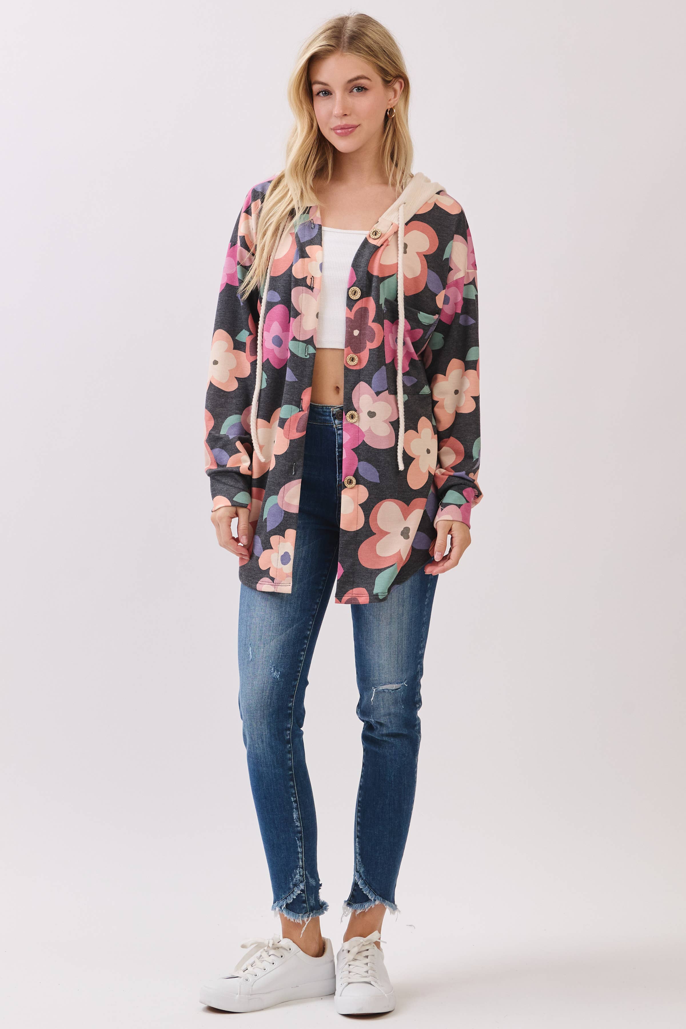 Add a playful pop to your layering lineup with this retro-inspired floral shacket. Made from a soft knit fabric, it features a button-down front, drawstring hood, and relaxed fit for all-day comfort. The bold, colorful flower print gives it a fun and carefree vibe-perfect for transitional weather or cozy casual days. Size S- XL MADE in USA
